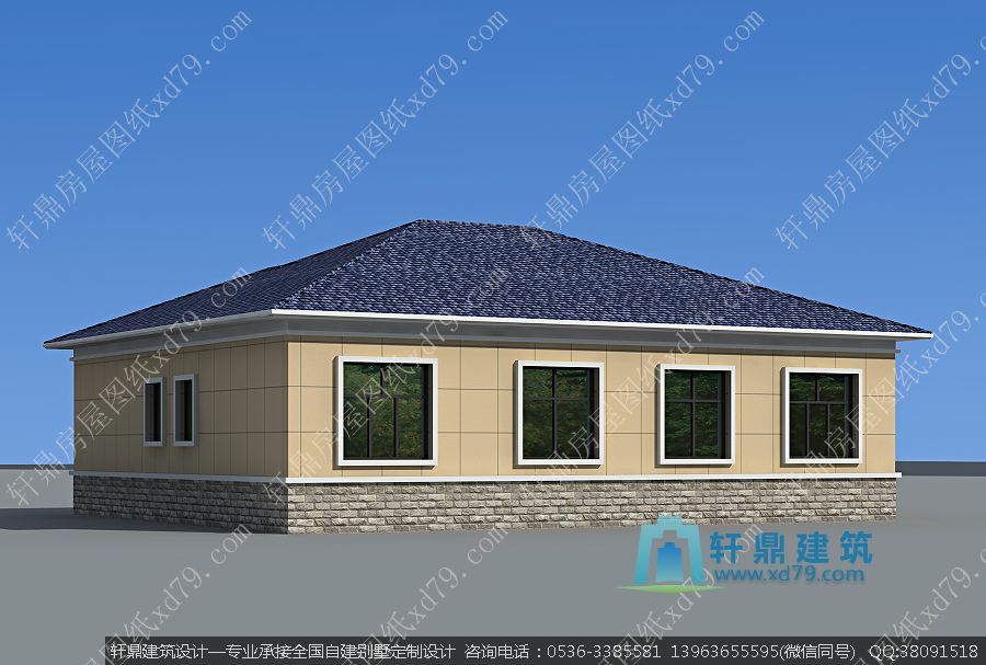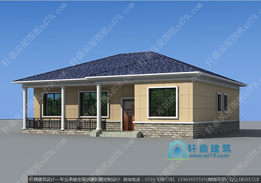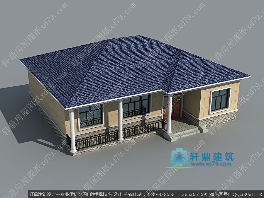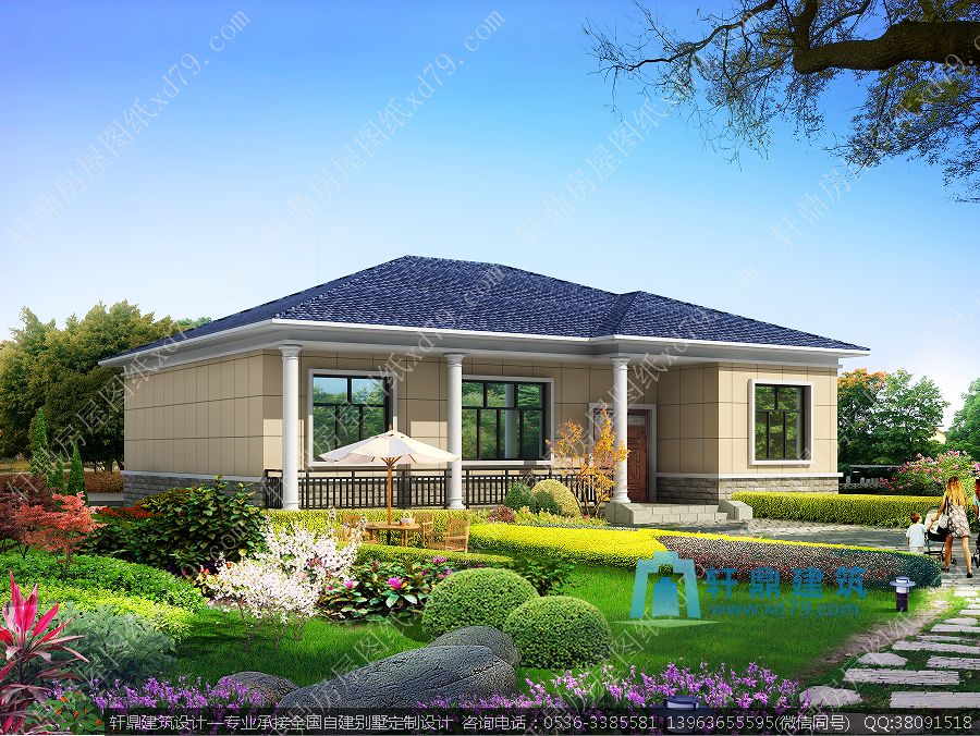 本方案为一层别墅设计图,整体造型美观大气,布局合理,施工简单,造价低,适合农村家庭建造,再加上一个小院就更加完美了。