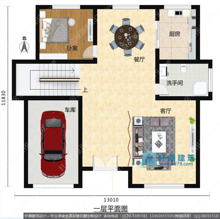 一层:客厅、餐厅、厨房、卧室、卫生间、车库
