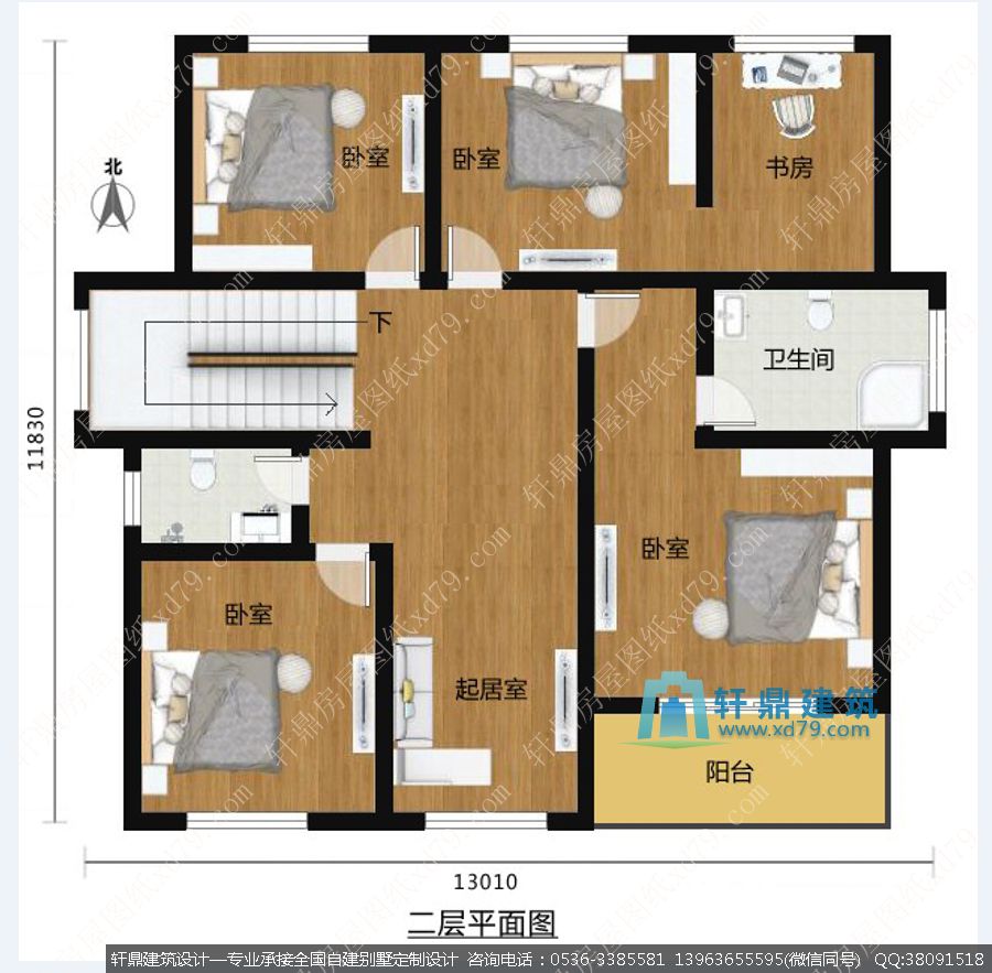 二层:起居室、主卧(带卫生间)、卧室、书房、卫生间、阳台