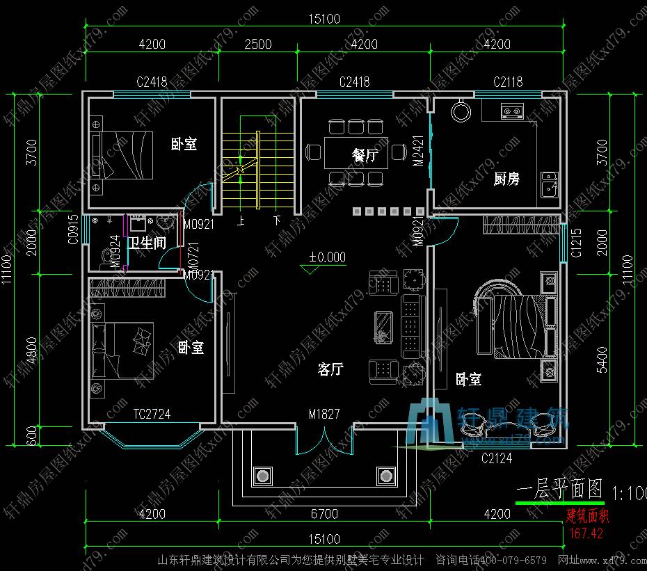 一层平面图:本层建筑面积167.42平方米,平面布局为:门廊,客厅,餐厅,厨房,卫生间,卧室1,卧室2
