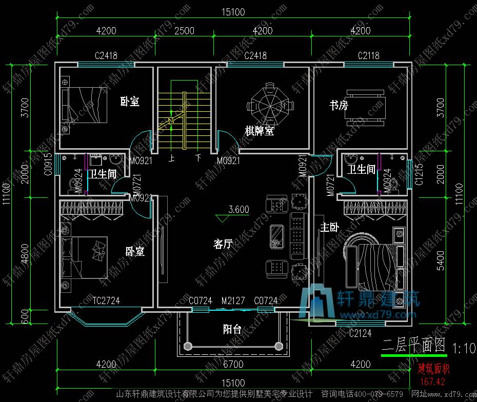 二层平面图:本层建筑面积167.42平方米,平面布局为:阳台,客厅,主卧带独立卫生间和书房(卧室3),卧室4,卧室5,棋牌室,卫生间