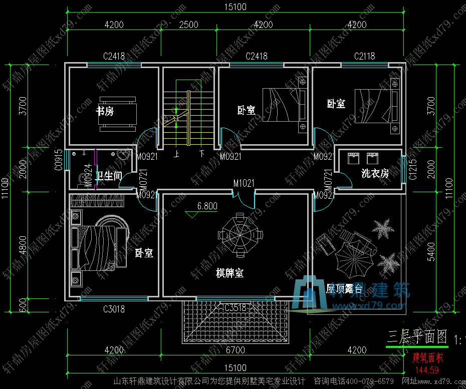 三层平面图:本层建筑面积144.59平方米,平面布局为:棋牌室(可做客厅),卫生间,洗衣房,露台,卧室6,卧室7,卧室8,书房。
