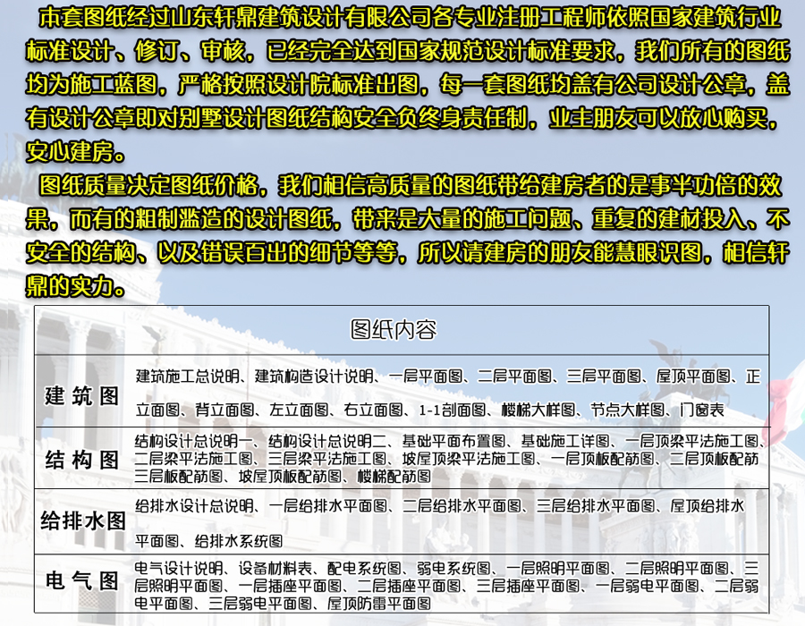 很多网站以光盘的形式出售图纸,宣称有6000多套甚至更多,请您务必慎重考虑,那些光盘里面大部分只有效果图而没有施工图,有CAD图纸的设计内容也是不完整的,只是方案图而不是施工图,缺少了节点图、结构配筋图、水电图等等,如果您对建筑行业不了解,等收到光盘并付款后发现里面的图纸不完整就于事无补了。选择齐全的施工图纸才能用于建房。