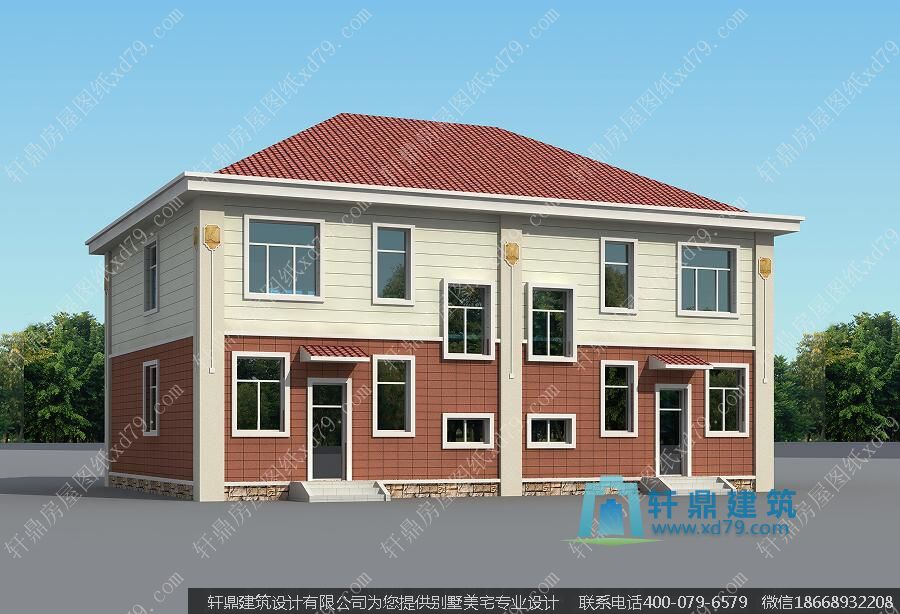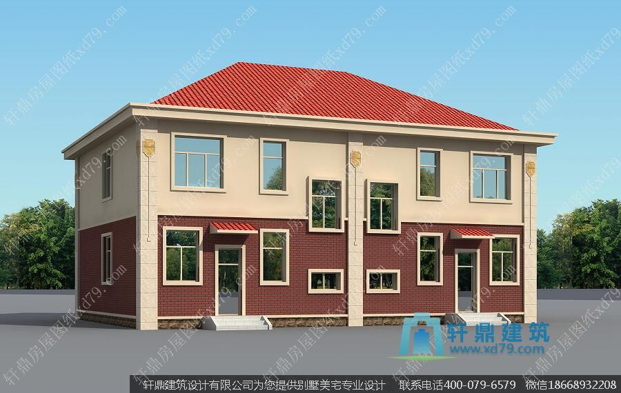 此套图纸为轩鼎建筑设计公司设计的一套二层兄弟双拼户型农村自建小别墅。外墙为一楼枣红色真石漆或瓷砖,二楼乳黄色长效外墙漆。有喜欢本套图纸的朋友可以直接订购此全套施工图纸,图纸非常详细。