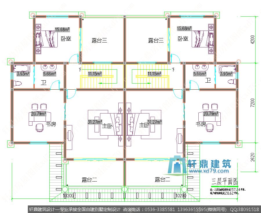 三层:卧室、书房、卫生间、大露台