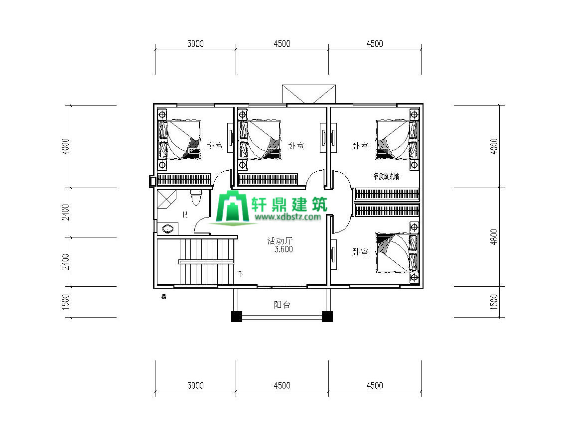 一层 按照吴总要求,设计一个卧室,餐厅(留有后门),厨房(设有烟囱),客厅,杂物间,卫生间;二楼配有四个卧室,一个卫生间,一个小的活动厅以及阳台。一层的建筑面积117㎡,二层的建筑面积121.43㎡。