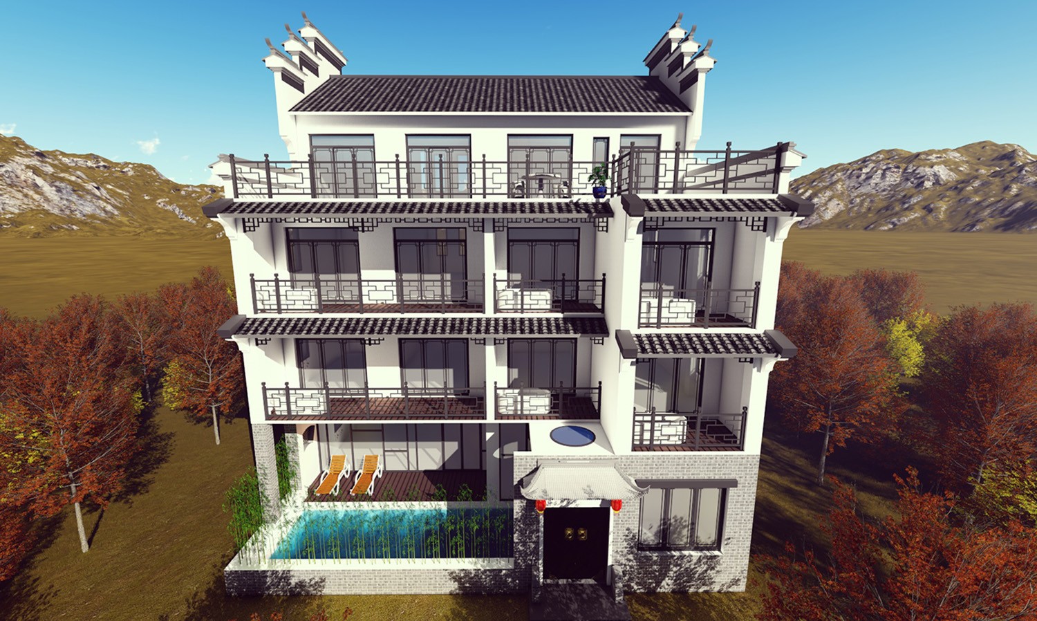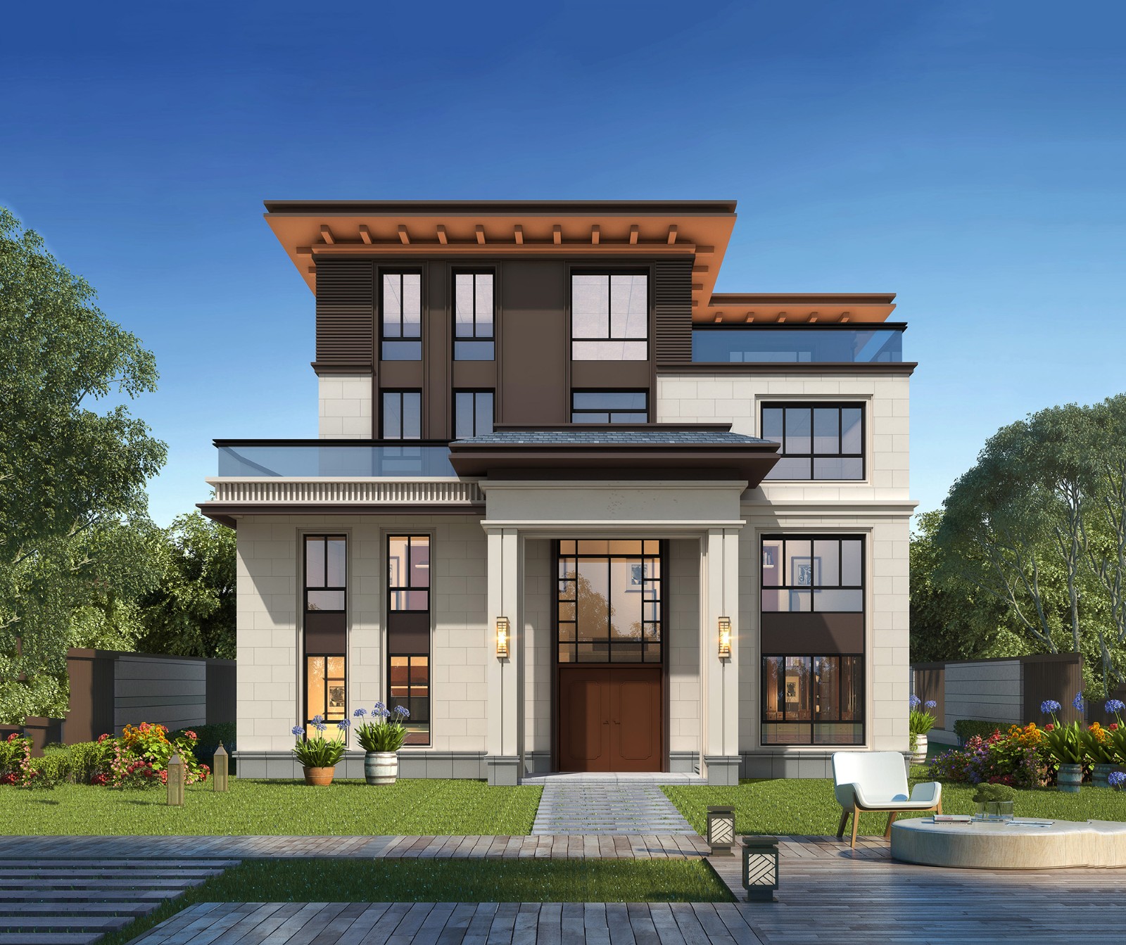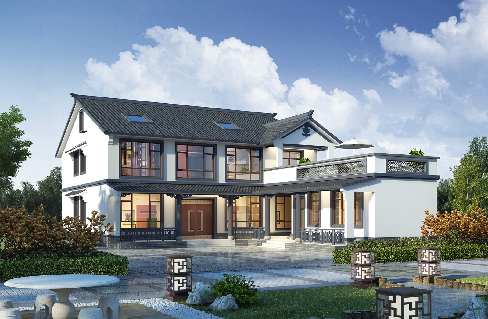 新中式别墅是在传统中式建筑的基础上改进的,本质上是和现代风格融合的建筑,保留中式韵味的同时又使其更贴