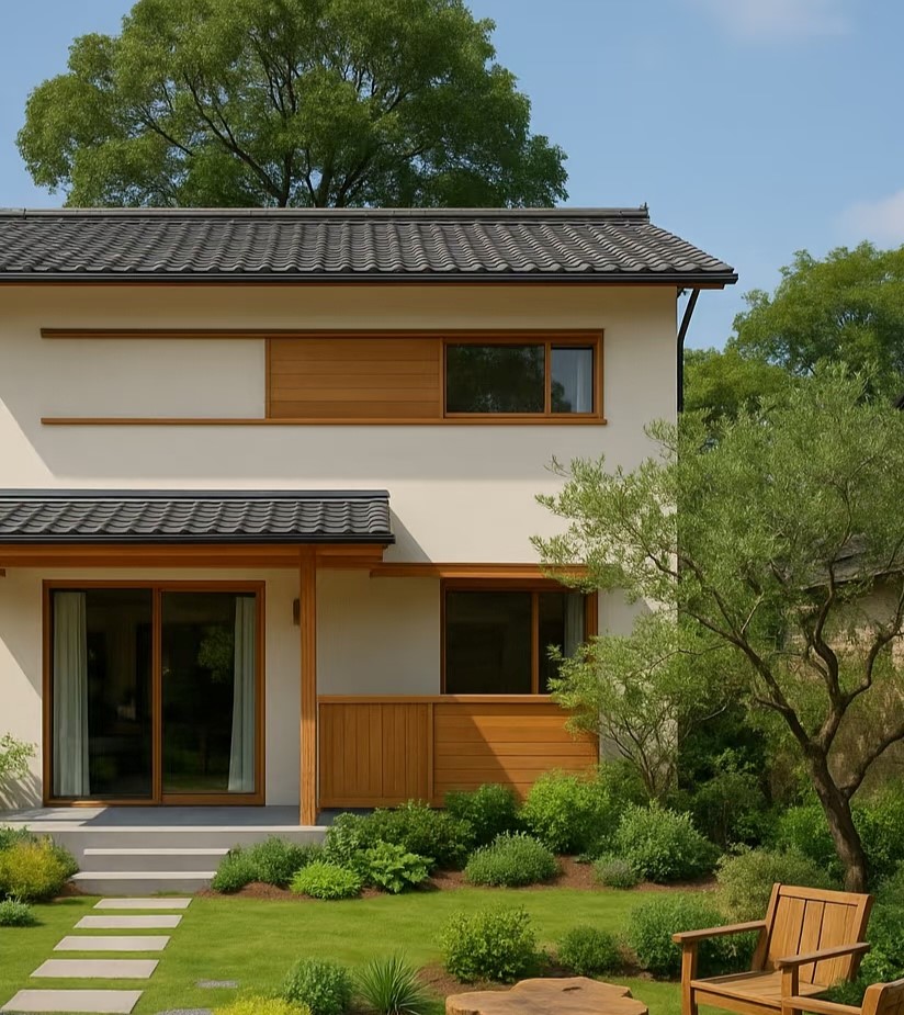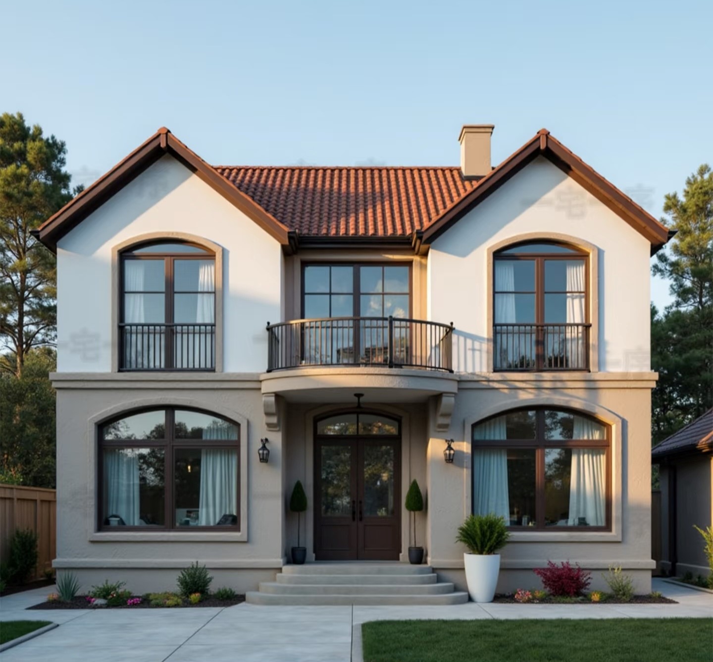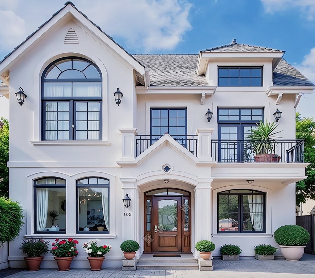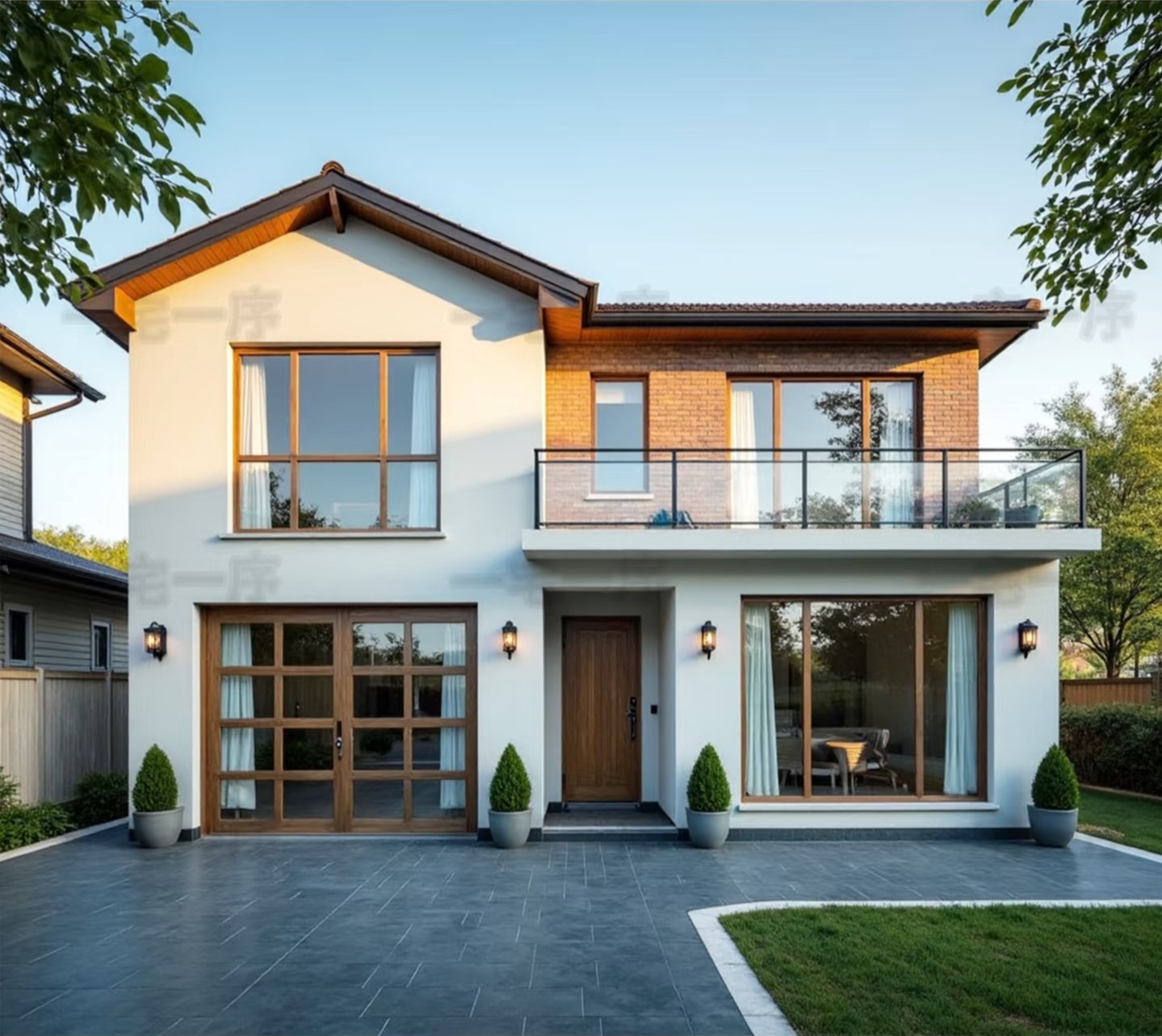 传统与现代结合的设计风格。房屋主体采用浅色外墙,搭配深色的木制门窗和装饰线条,显得既温馨又典雅。前院