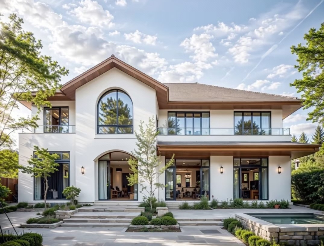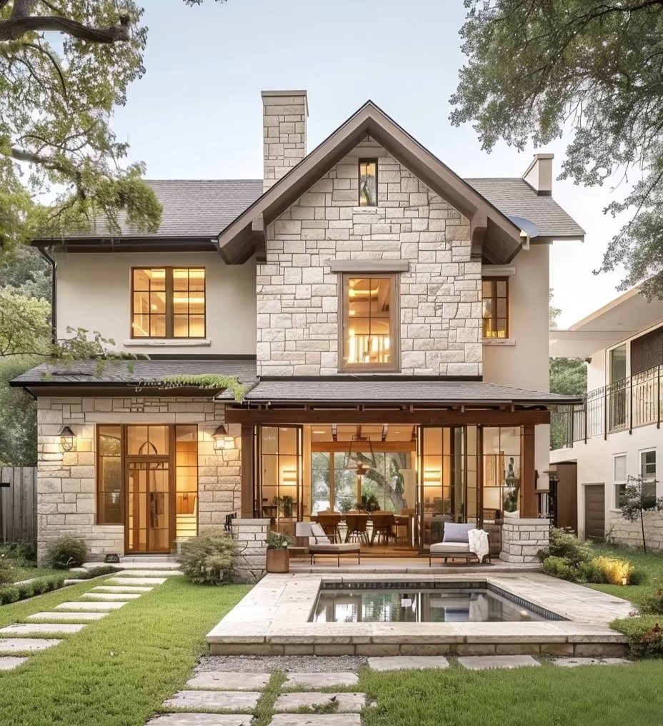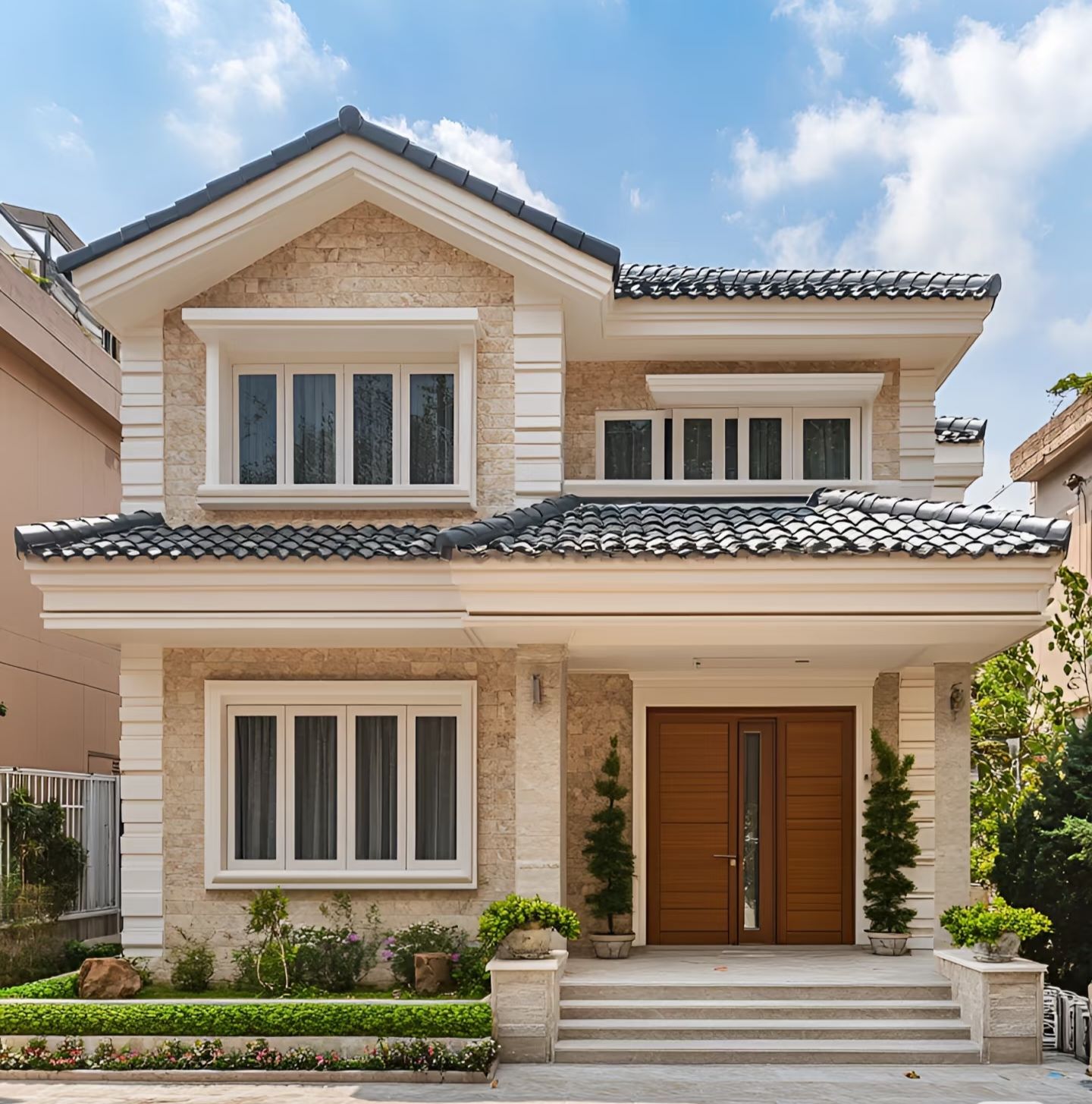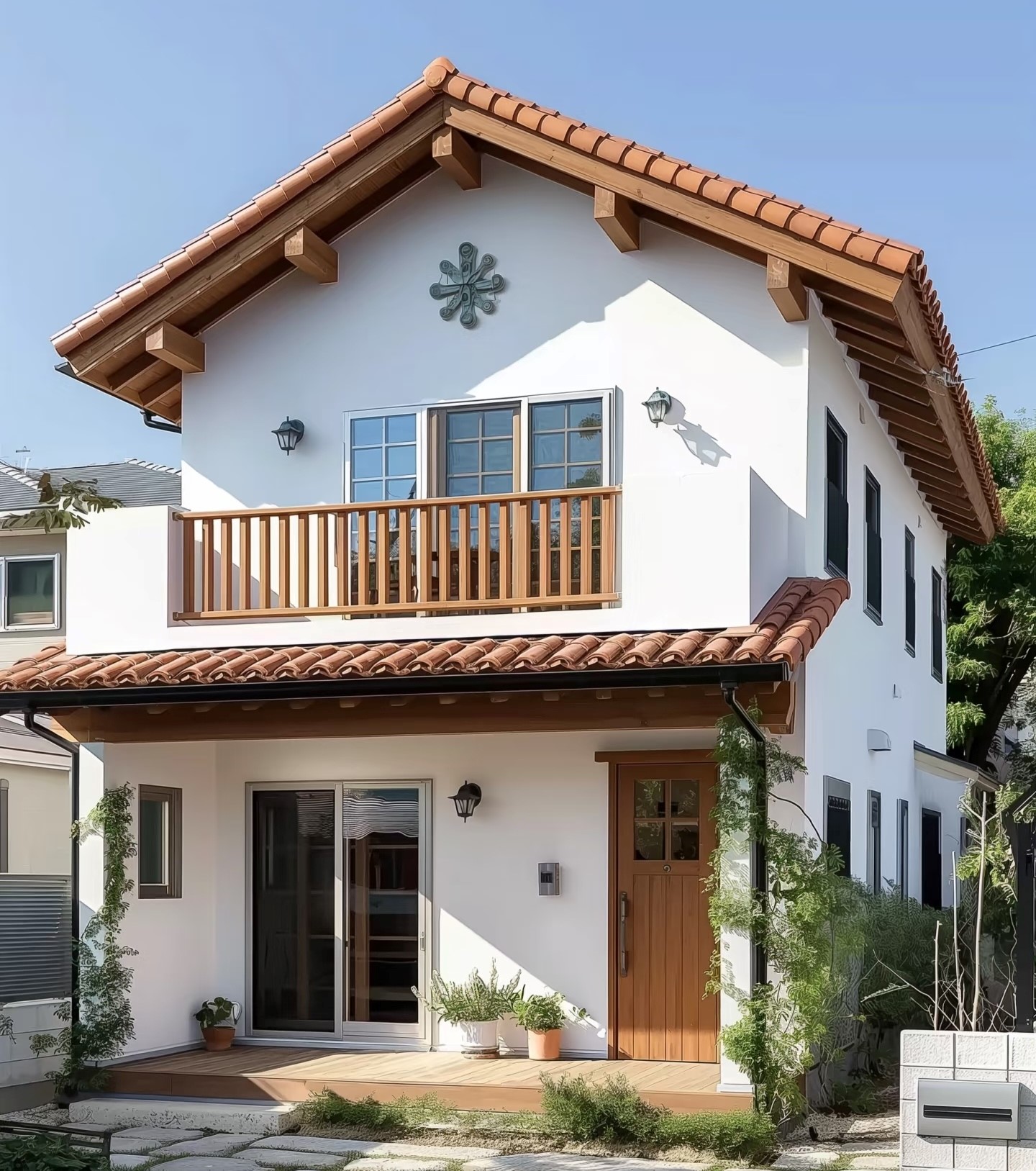 传统与现代结合的设计风格。房屋主体采用浅色外墙,搭配深色的木制门窗和装饰线条,显得既温馨又典雅。前院