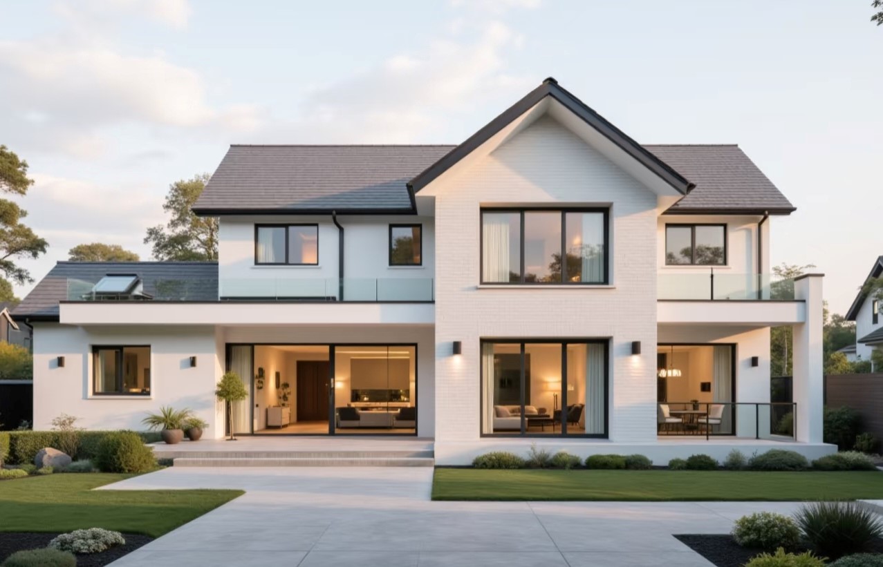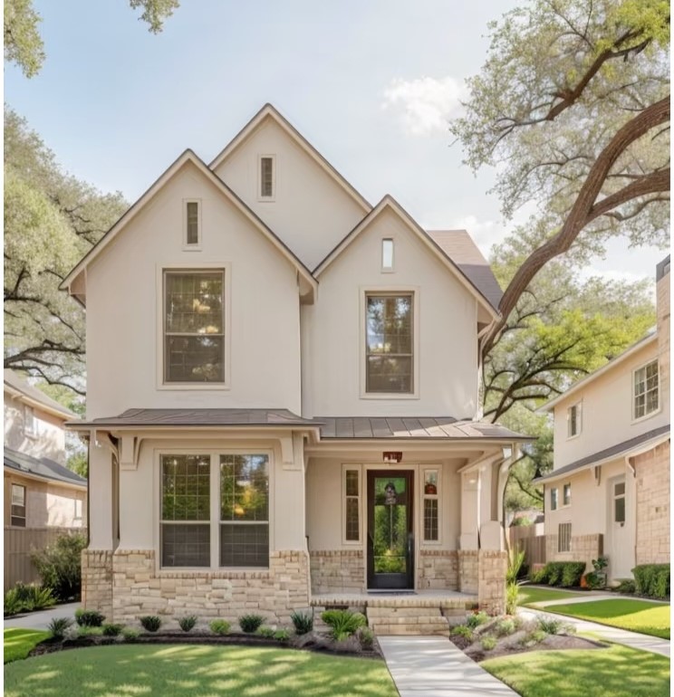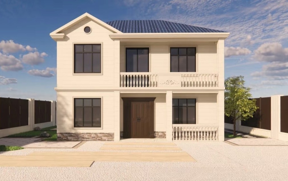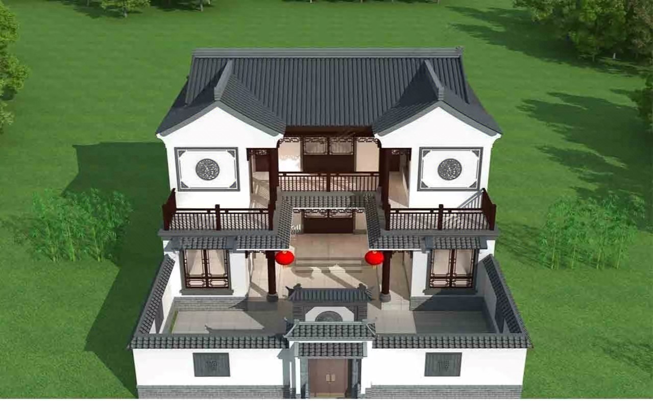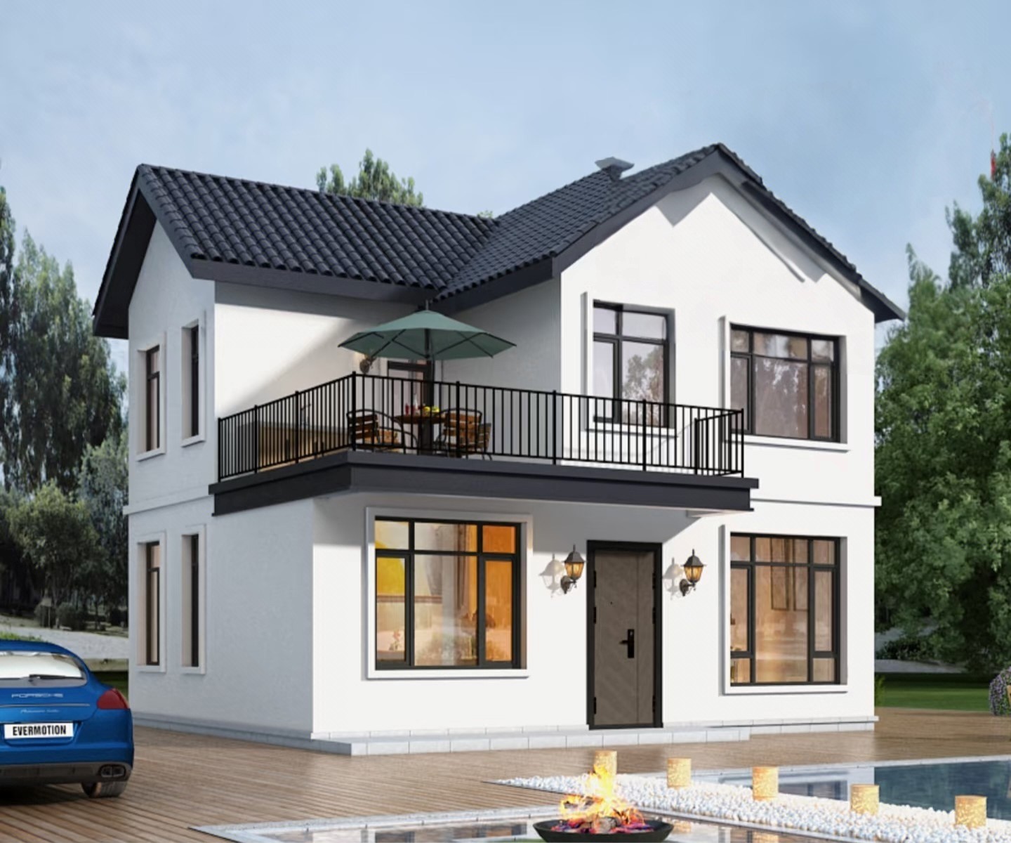 传统与现代结合的设计风格。房屋主体采用浅色外墙,搭配深色的木制门窗和装饰线条,显得既温馨又典雅。前院