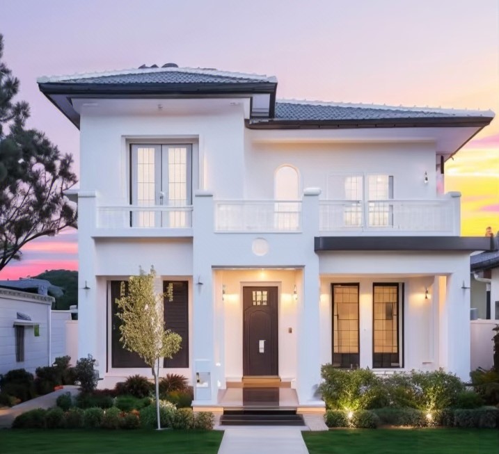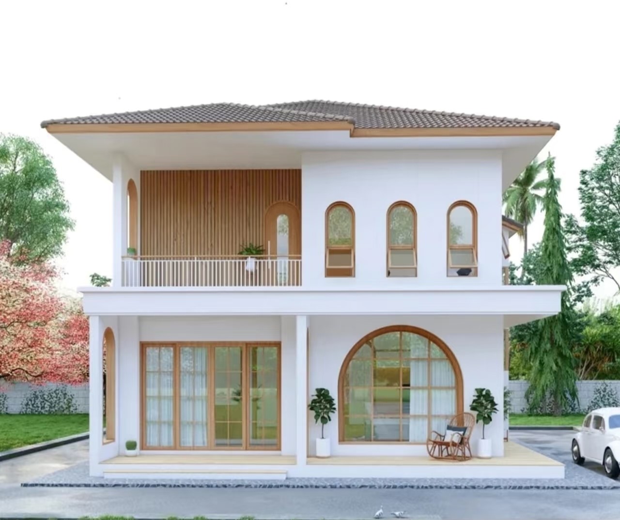 别墅设计以白色立面简洁大方,木质屋顶与装饰增添温暖质感,弧形窗打破规整,让建筑在秩序中灵动。周围绿植