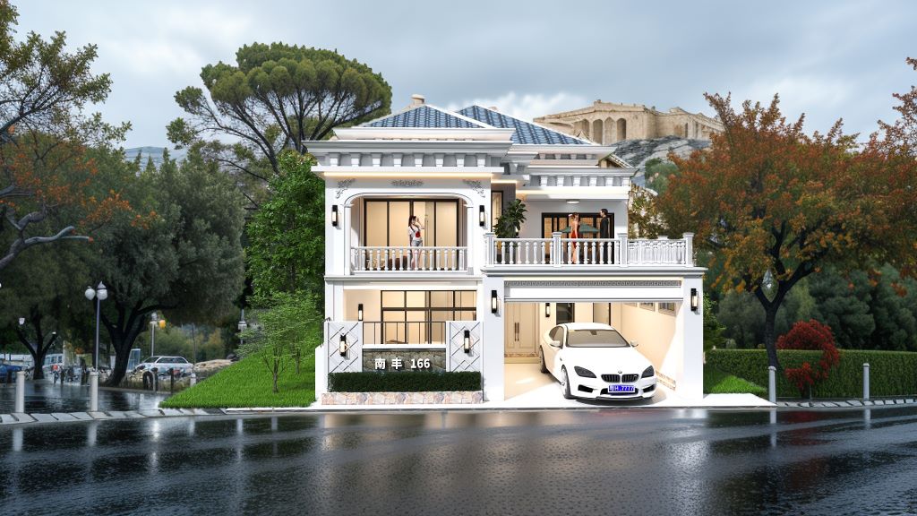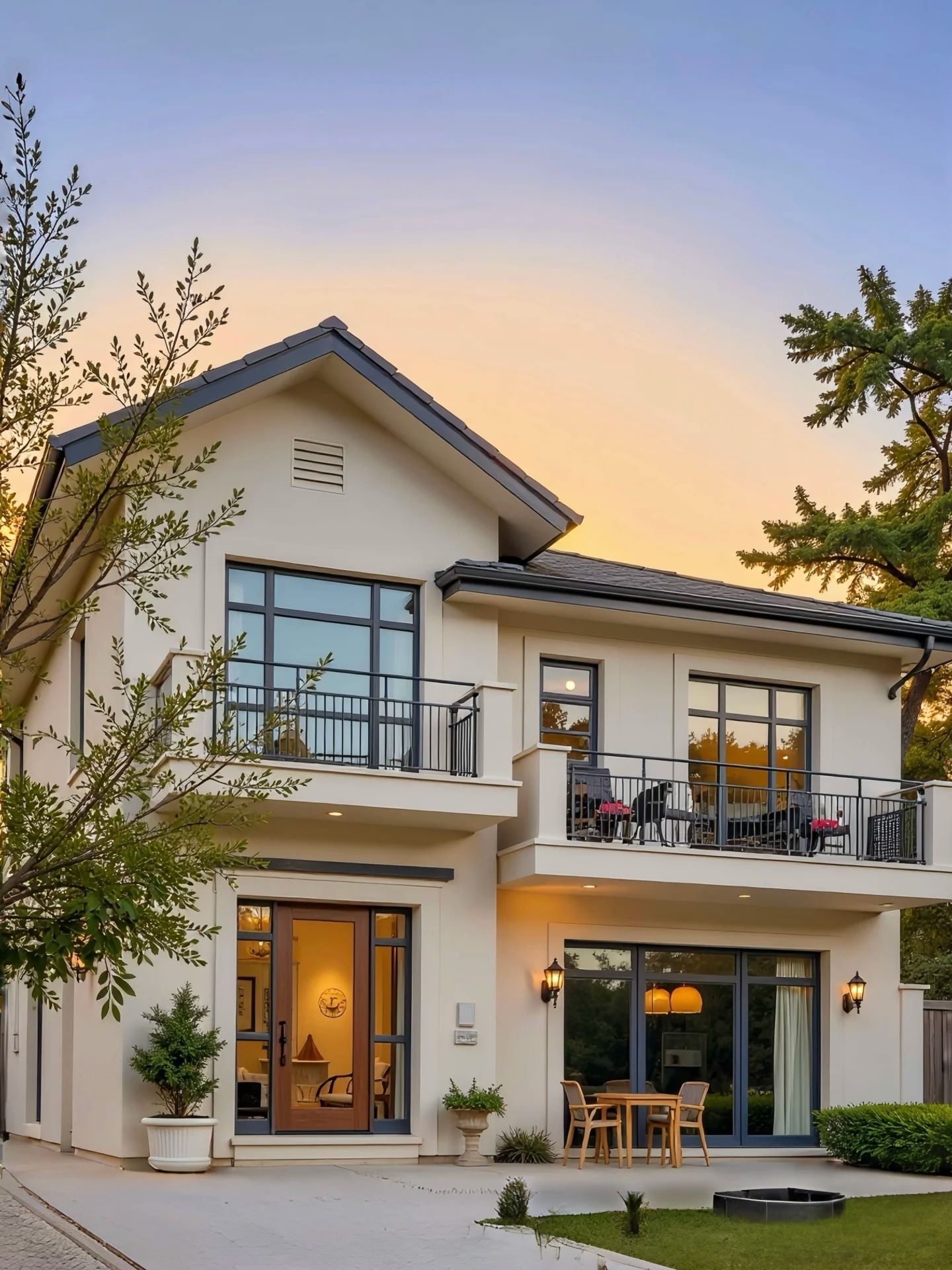 现代优雅风格的二层别墅,以其精致的设计和高品质的居住环境脱颖而出。别墅采用浅色石材或瓷砖外墙,搭配深