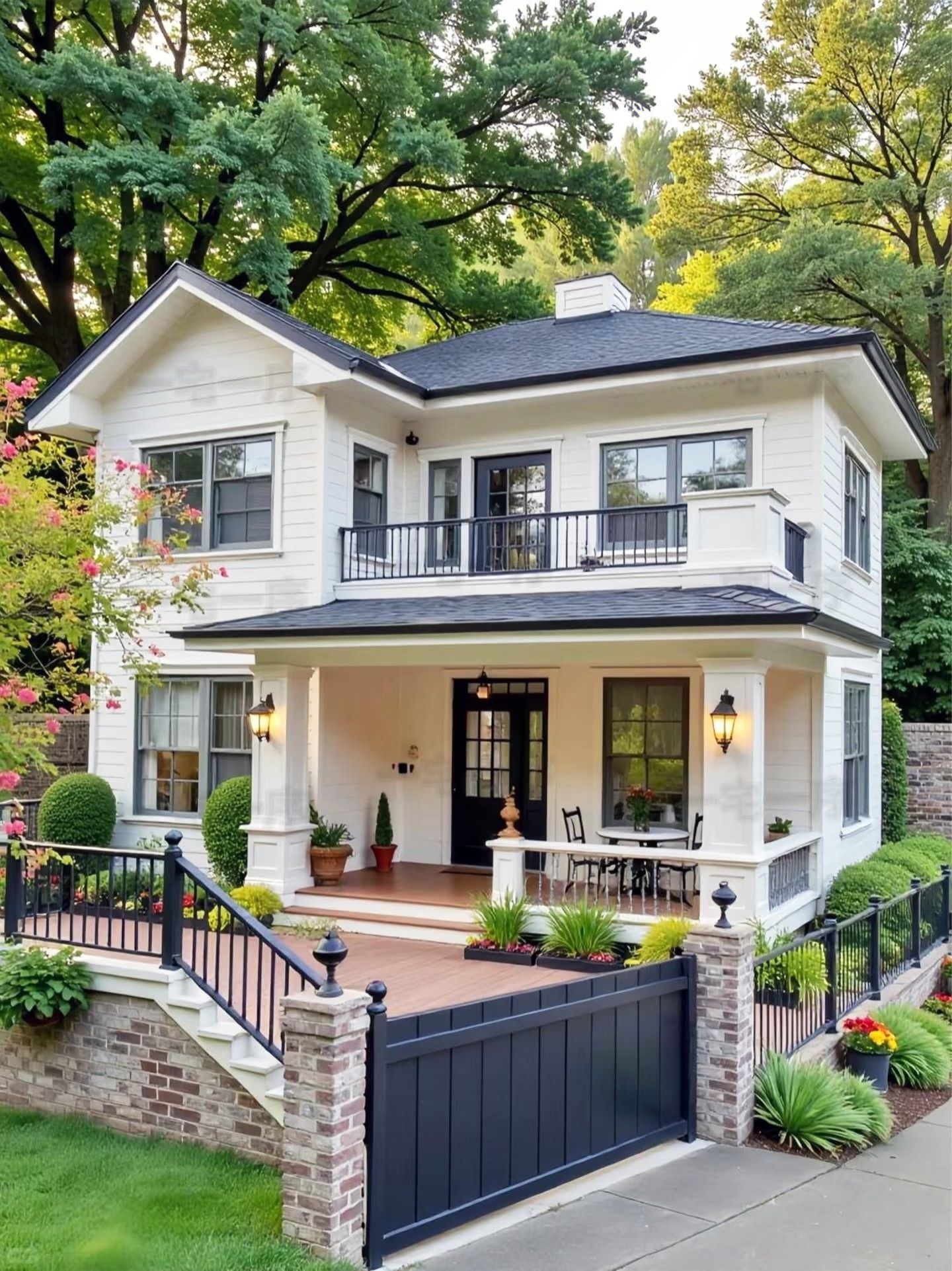 这座两层现代简约风格农村自建房,以白色外墙搭配深色屋顶展现大气简洁的外观,前院黑色铁艺围栏兼顾私密性