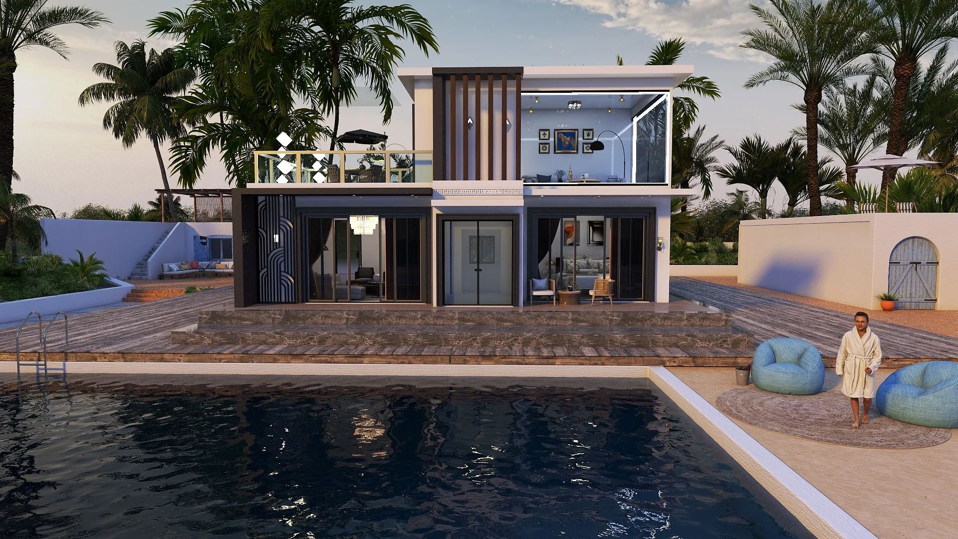 这款现代简约风格二层海滨别墅,融合热带度假元素与实用设计,白色外墙搭配深色线条,配以全景玻璃门窗与屋