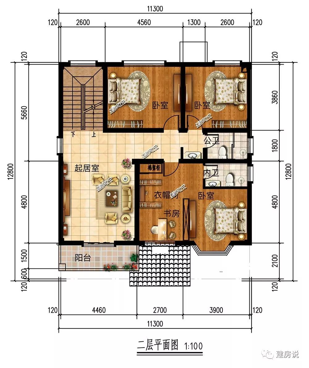 二层:3个卧室主次分明;起居室便于家人之间沟通与交流;起居室外的阳台设计,利于通风与采光。