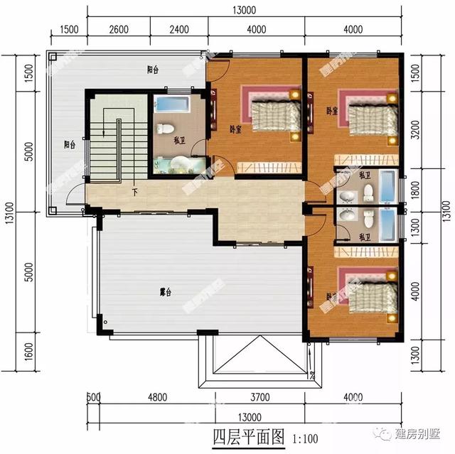 布局说明:首层配有一室两厅一厨一卫,户型通透;二层设有三室一厅两卫,配书房和生活阳台;三层的布局和二层是一样的;四层配有两间卧室备用,室外用上露台和小凉亭观景。