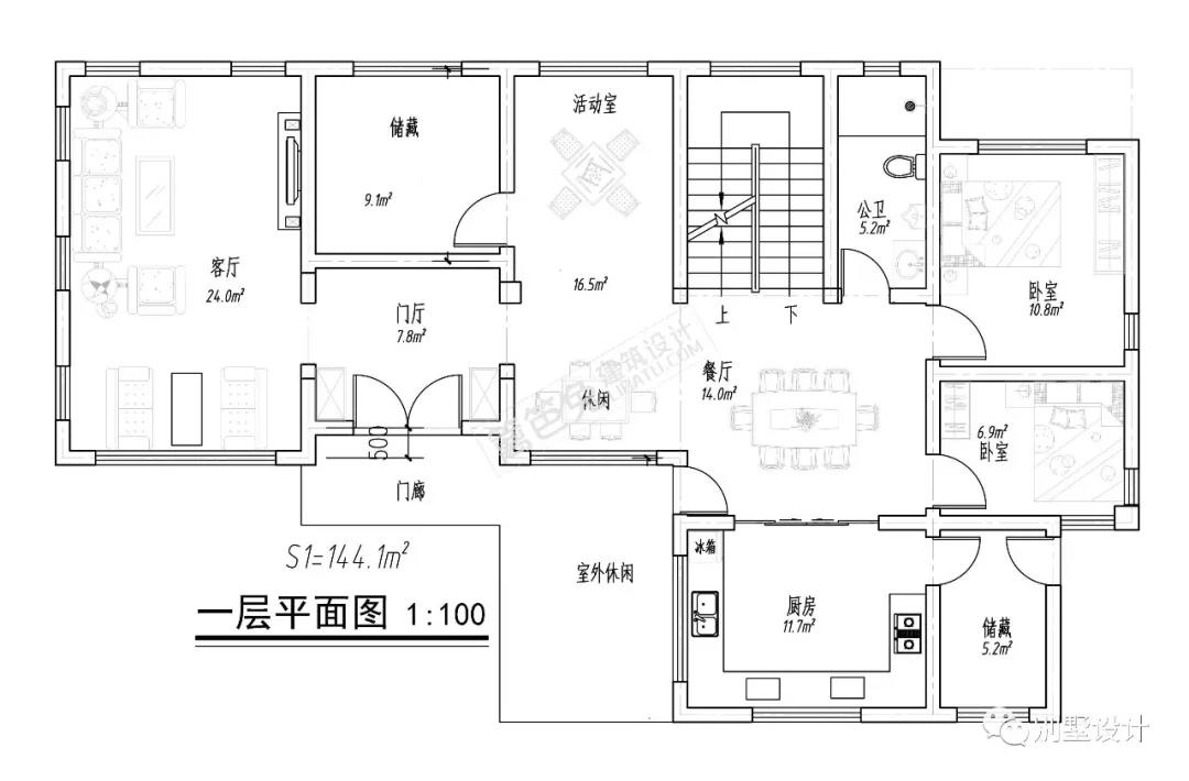一层设计图:门前有门廊和室外休闲场所,进门后首先是门厅,还设有客厅厨房和餐厅,还设有两间卧室,还有储藏室和活动室