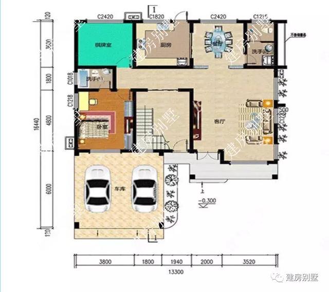 13.3×16.44米,配有开放式的车位,房型也是比较个性化的,墙面主要是用真石漆来装饰,屋面配蓝色琉璃瓦和一个老虎窗。