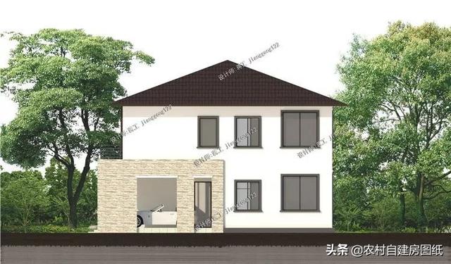 建筑整体为现代风格,立面底部以文化石展现质感,配合上方米白色真石漆和深色屋顶达到颜色的自然过渡,让建筑整体性和连贯性更好。同时,这种配色较为耐脏,方便日常打理和保养。屋顶整体坡度较小,但不影响造型完成度,且方便后续施工。建筑门窗采用现代元素装饰,镂空设计和线条形状结合让门窗极有特色。阳台选用现代的金属护栏,弱化墙体厚度增加现代中式韵味。