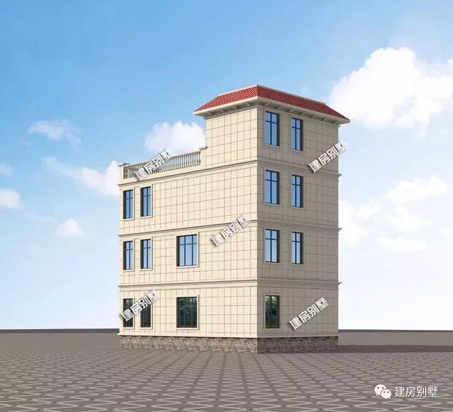 该栋别墅主墙面用到棕色面砖和浅米色真石漆装饰,按照600×600的比例进行墙面分缝处理,看起来比较美观,屋面四周用红色琉璃瓦装饰,远看上去营造出一种斜屋面的既视感。