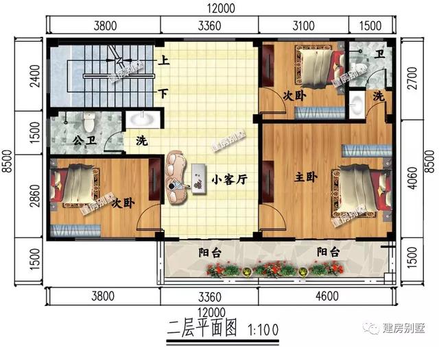 二层:三室一厅两卫,主卧面积大且配独卫,外带大阳台设计。
