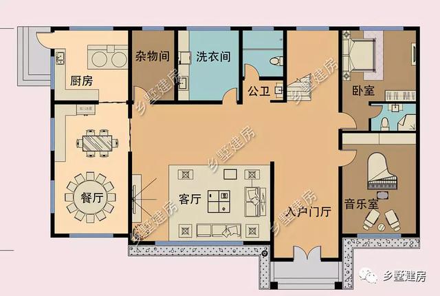 一层入口很宽敞,设有挑空客厅,餐厅,厨房,杂物间,洗衣间,公卫,卧室和一间音乐室。左侧的餐厅设有小桌子和一张大圆桌,家里如果有客人拜访,圆桌就比较方便。厨房也是双灶设计,比较符合农村的风格。右侧是一间带私卫的卧室,可作为老人房。还有一间音乐室,可以摆放一架钢琴,供儿童使用。