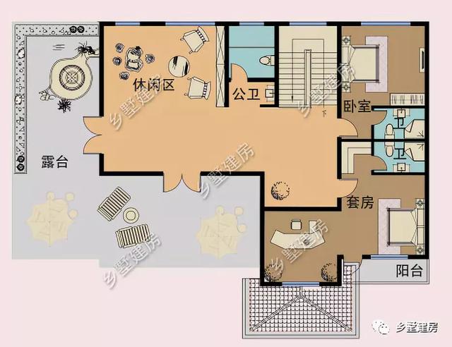 三层右边是一间带私卫的卧室和一间带阳台的套房,套房里可以摆放个小沙发。平时想在房间里坐着玩玩手机都可以。楼梯上来处是一间公卫。左边是休闲区域,给了住户极大的娱乐空间。最左侧是一个大露台,喜欢盆景的朋友完全可以利用起露台来,摆放一个沙发都是没问题的!露台的设计让住户更加的亲近大自然。
