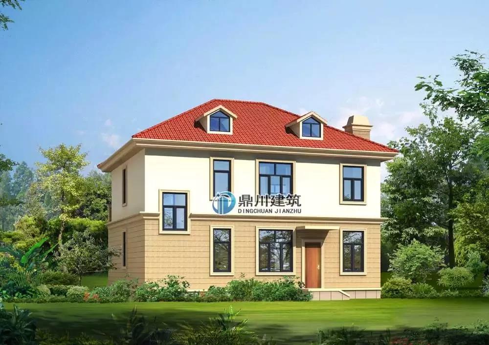 别墅外墙一层是米黄色的石砖装饰,二层是白色的面漆,带有装饰性的柱子,还有红色的屋顶,黑色的窗框装饰,别墅整体呈现较为温柔的现代风格。