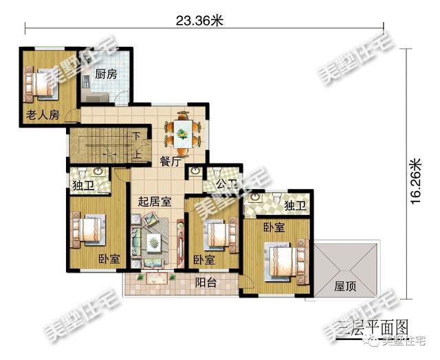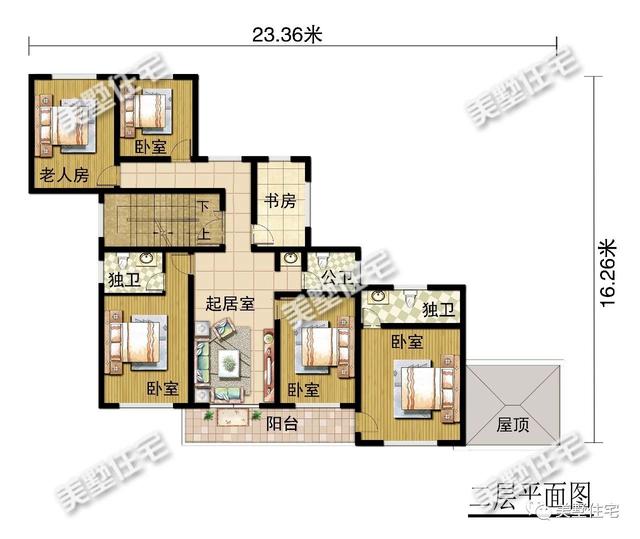 三层:设起居室、餐厅、厨房、四间卧室、三间卫生间。