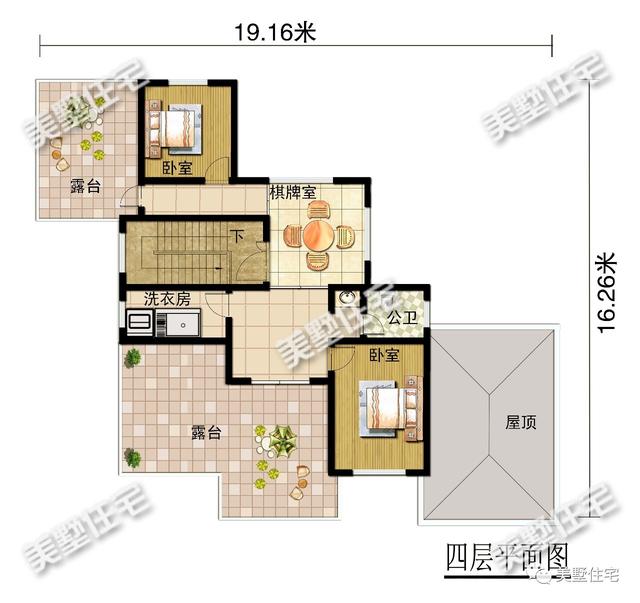 四层:设棋牌室、洗衣房、两间卧室、一间卫生间、两个露台。