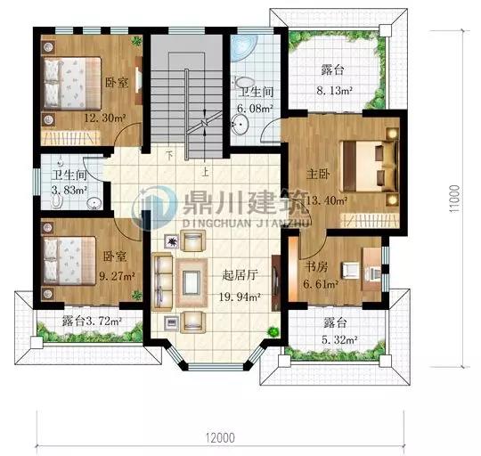 二层设计图:起居室,三间卧室和一间书房,还有正面朝向和背面的露台,观景方便,通风好