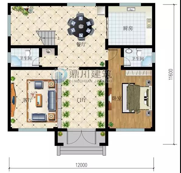 一层设计图:玄关,客厅餐厅和厨房,还有两间卧室