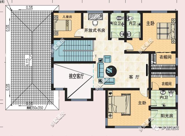 二层设有:3卧室,书房,挑空客厅,卫生间,