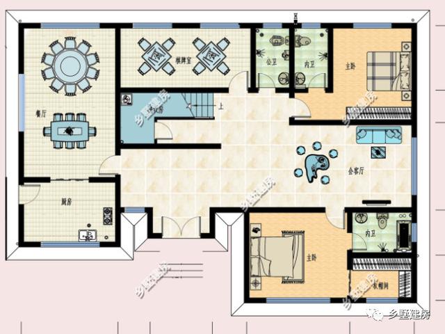 一层设有:2套房,餐厅,厨房,洗衣房,棋牌室,会客厅,卫生间
