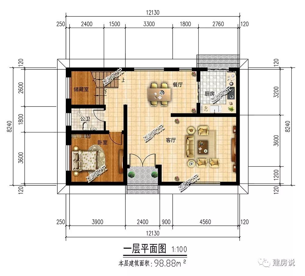一层:设有1间卧室,离卫生间近,可当作老人房;储存室可堆放家中杂物,厨房餐厅与客厅隔开,洁污分离。