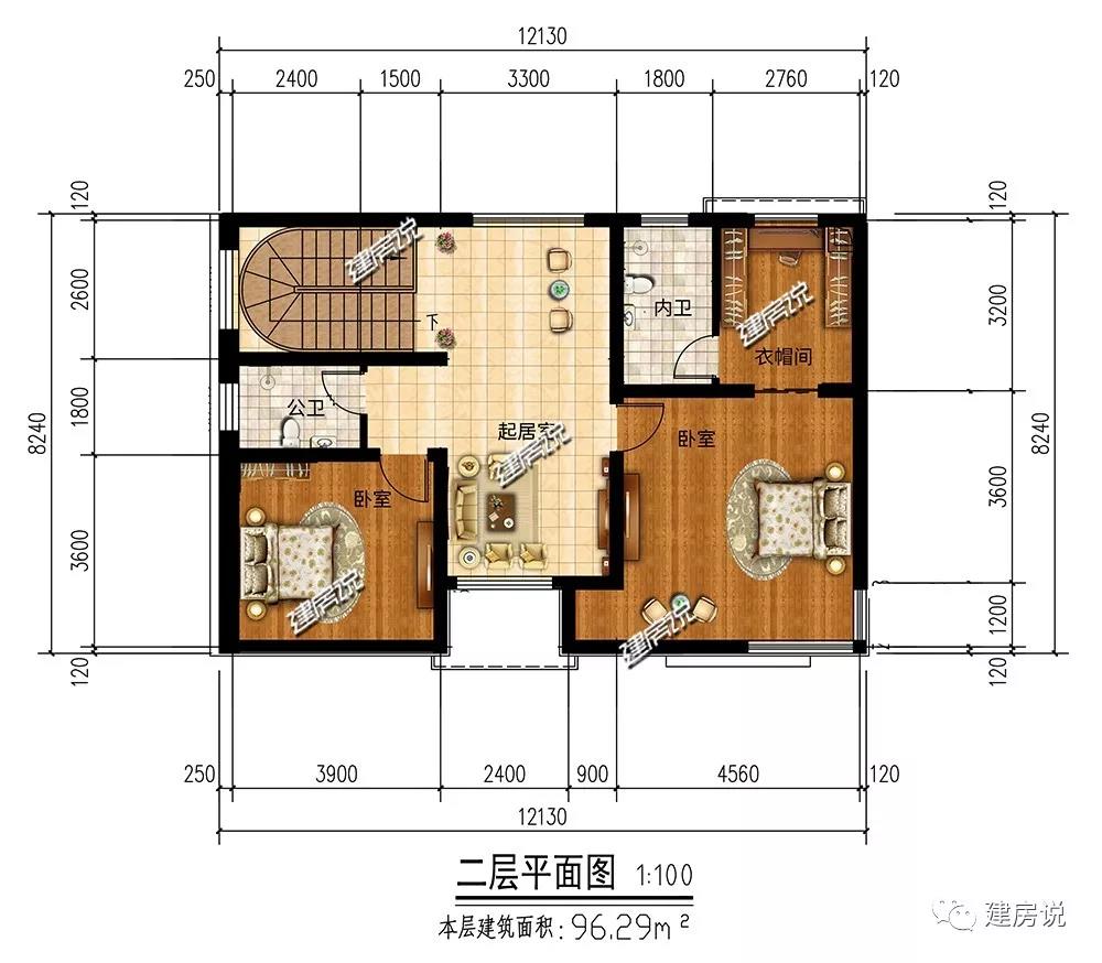 二层:设有2间卧室,主次分明;起居室方便家人日常生活,沟通感情。