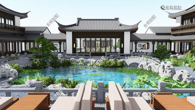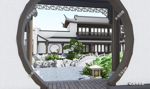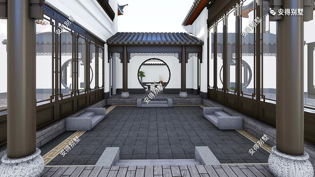 本栋四合院采用传统的白墙灰瓦,搭配木质格栅装饰,庭院小桥流水与绿化相融合,给人美好与恬静;