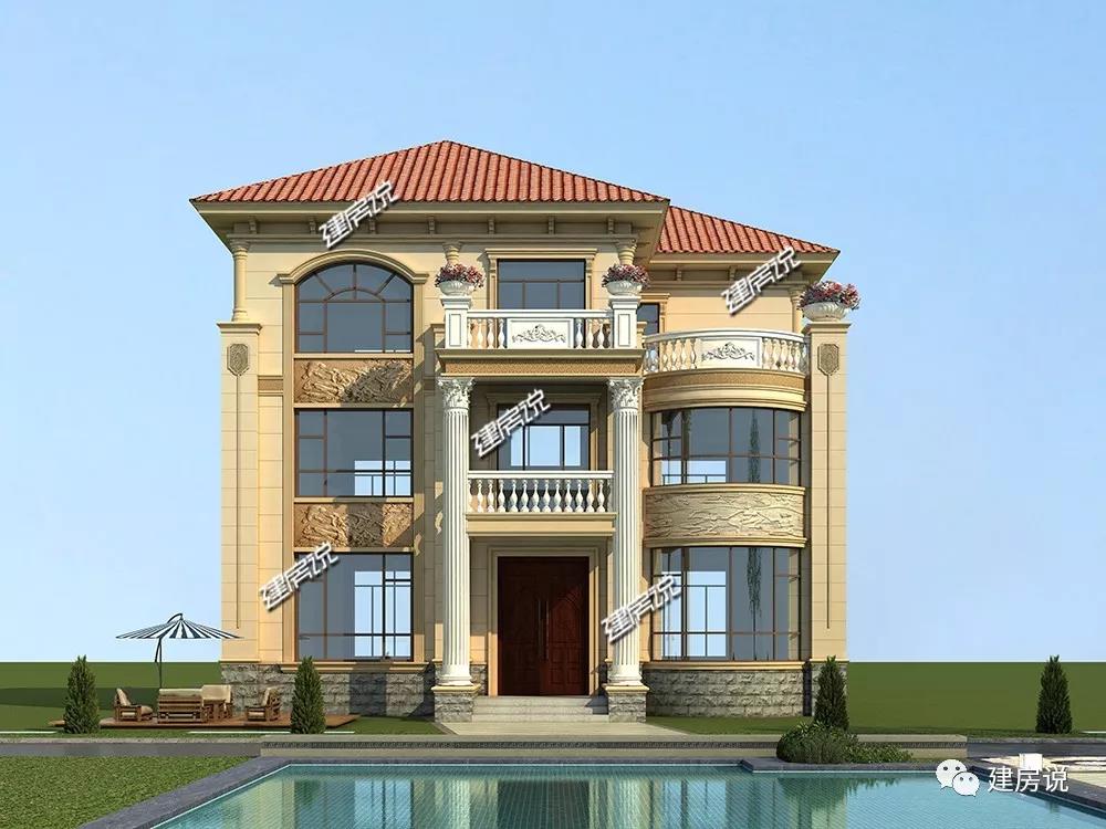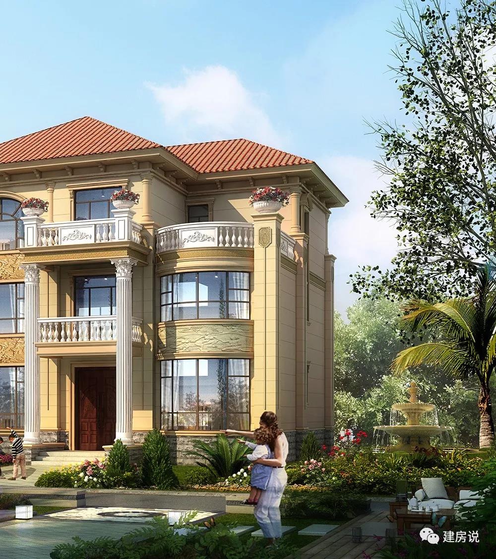 别墅外墙是米黄色的面漆,有横纹装饰,白色的柱子和栏杆,还有金黄色的浮雕装饰,搭配橘红色的琉璃瓦。