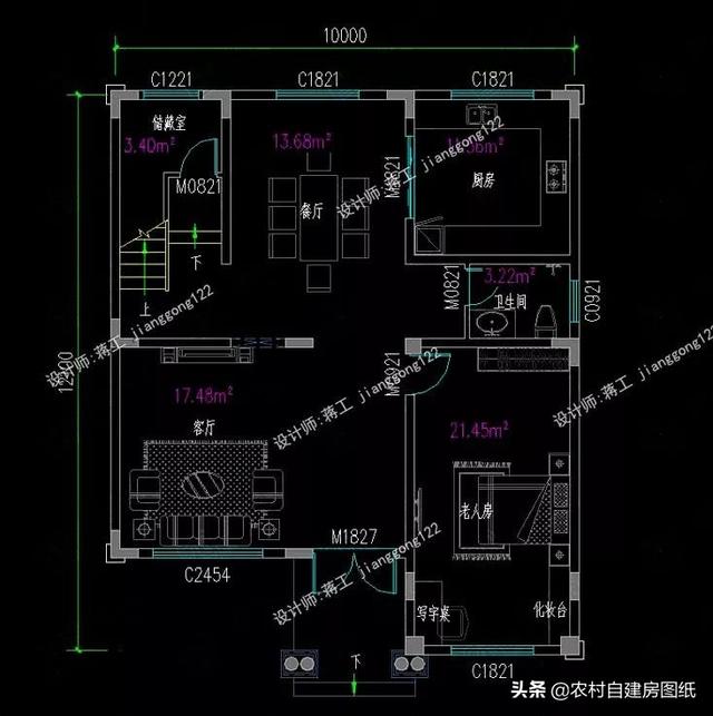 一层:进门是大厅,老人房朝南占地面积非常大,可以根据家庭的需求设计内卫。厨房和餐厅为一体非常方便。