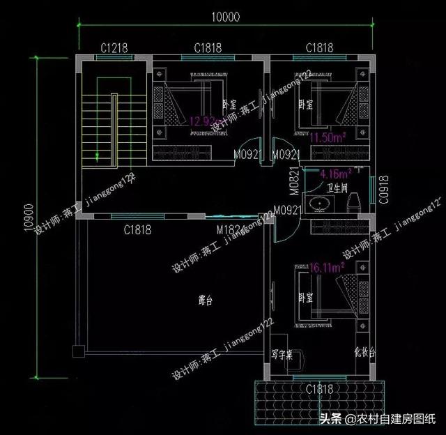 三层:设计有3间卧室、卫生间和屋顶露台。