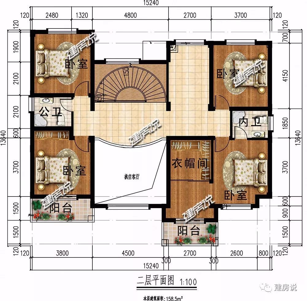二层:设有4间卧室,主次分明;旋转楼梯与挑空客厅是经典的欧式搭配,提升别墅档次。