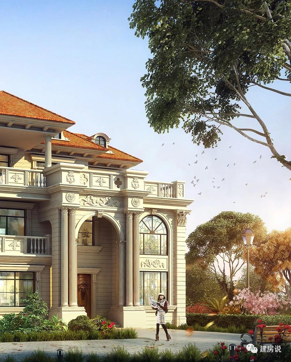 别墅外墙主体以米黄色真石漆装饰,屋顶是红色琉璃瓦,欧式罗马柱衬得整栋楼更加洋气,屋顶的老虎窗更是增添了几分韵味。