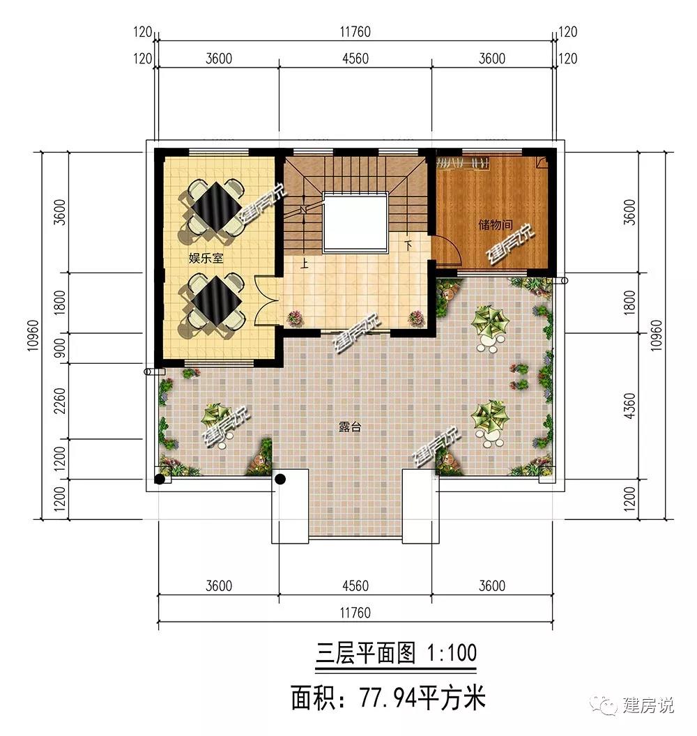 三层:设有宽阔娱乐室,家人或亲朋好友可以一齐打牌娱乐;设有储物间,方便贮存杂物等物件;超大露台,方便晾晒衣物、农作物等。