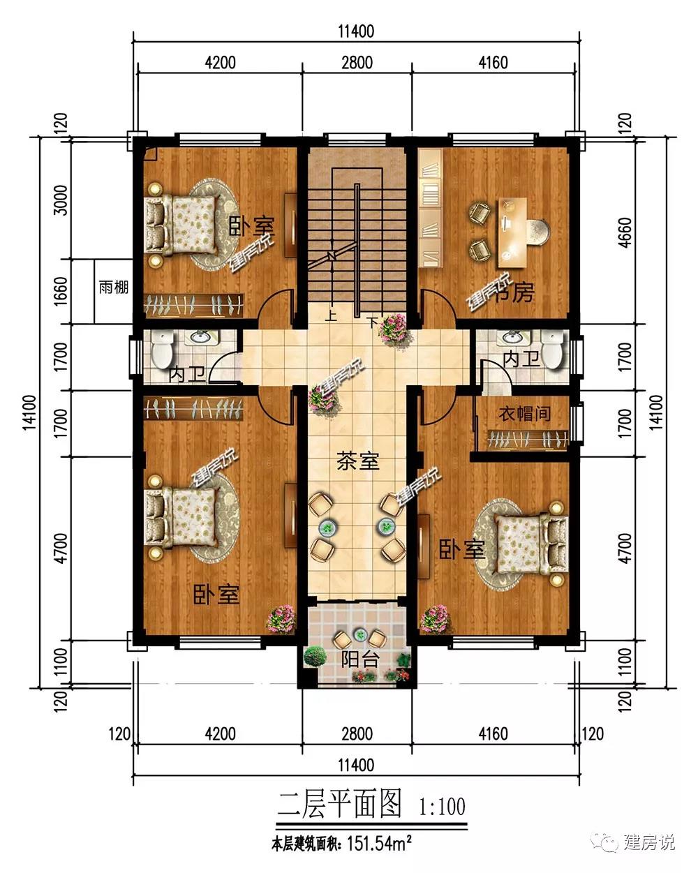 二层:设有3间卧室,主次分明;书房使整栋房子赋有书香气;茶室可供家人品茶聊天。