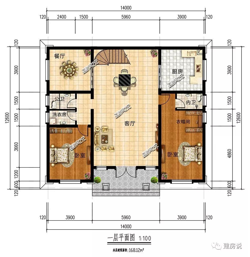 一层:设有2间主卧,主次分明;宽敞客厅,可供家庭娱乐;专门用餐的餐厅,团团圆圆。