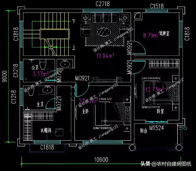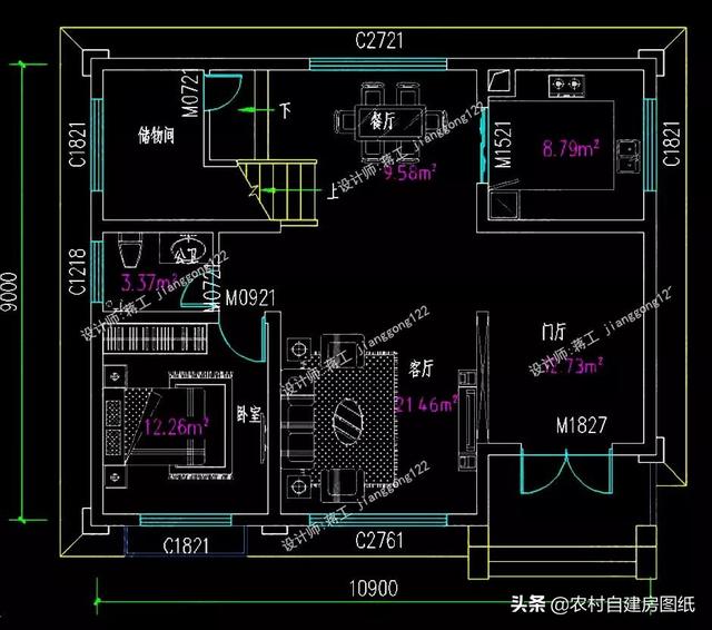 进门是门厅可以设置堂屋神龛,客厅和餐厅直线排列,空间非常大。一层卧室朝南方便家里的老人,公卫在卧室这边,起居方便,楼梯间下做了储物间,空间不浪费。