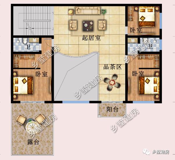 二层设置了三间卧室,一个起居室,一个品茶区,一个大露台,一个小阳台。