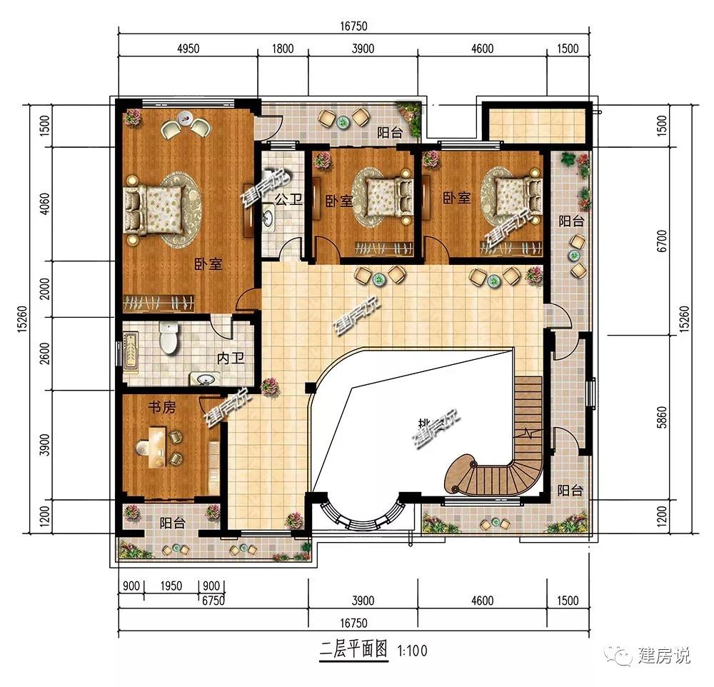 二层:设有4间卧室,主次分明;挑空旋转楼梯的设计使整个楼层明亮通透;阳台设计,使人心情舒畅。