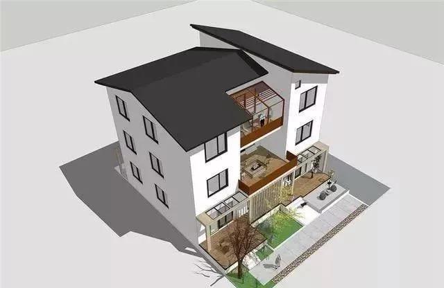 别墅外墙是纯白色,屋顶是青黛瓦,一共三层的设计,