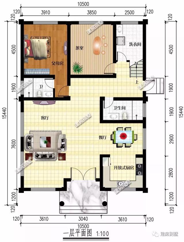 首层:配有一室两厅一厨两卫,父母房内设主卫,客厅宽敞空间大,配一间休闲茶室,客厅挑空设计
